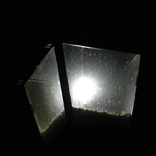 Provides light to parking lot. Filled with bugs.