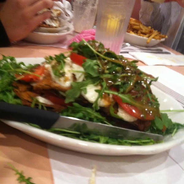 Pros Eggplant is definitely in a tower formation. Fresh mozzarella Cons Too much leafy green.