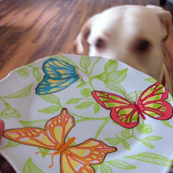 Empty Plate Of Salami And Cheese With Dog Watching